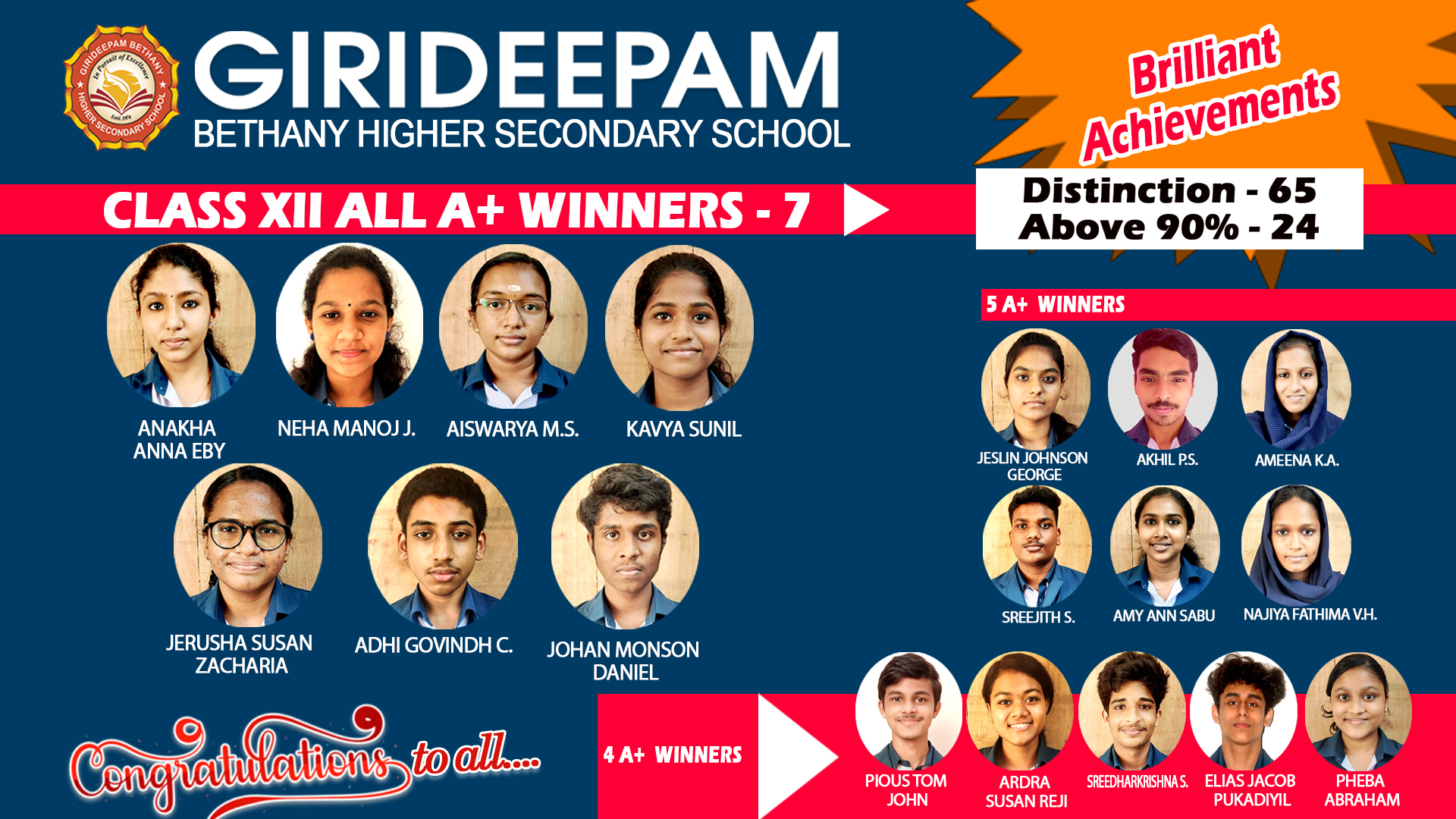 Girideepam Bethany Higher Secondary School with its motto ‘In Pursuit of Excellence’, aims at developing a wholistic arena of abilities and making every effort to take the student on a voyage of self-discovery and growing in wisdom. We equip our students to make use of all the better advantages to achieve their goals. Through learning, campus-life, family and homily atmosphere, wider exposure to new thinking etc in Girideepam; may the students be able to go beyond the boundaries and look ahead of the horizons and become good citizens and successful persons. I wish you all dearest Students, Teaching and Non-Teaching Staff gallons of good experiences and joy in Girideepam.